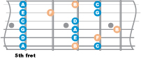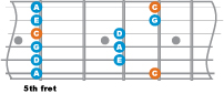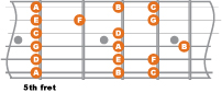In the key of A minor, there are seven notes: A B C D E F G. Here I have shown them arranged at the fifth fret.