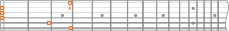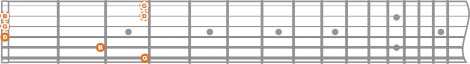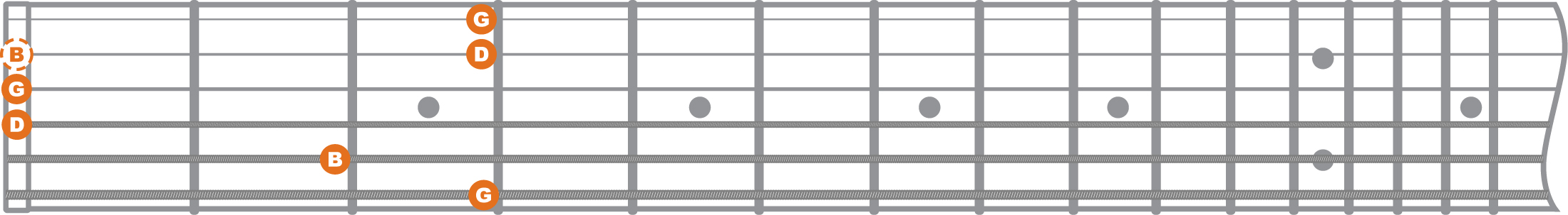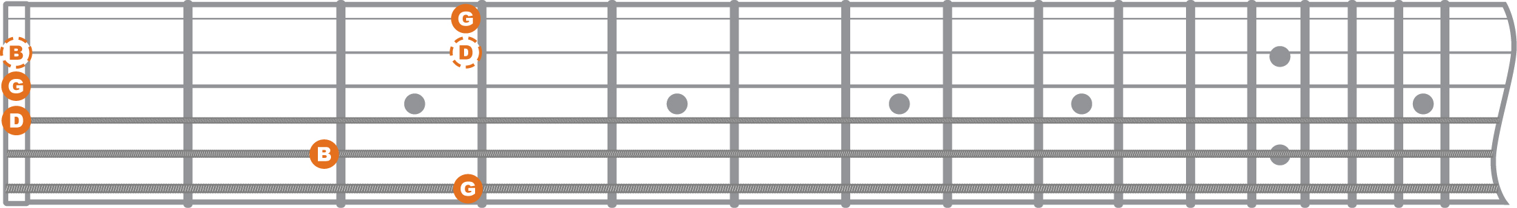 In this example, I’m going to use my knowledge of the fretboard to find all of the Gs, Bs and Ds on strings three, two and one that are within reach of the other notes: