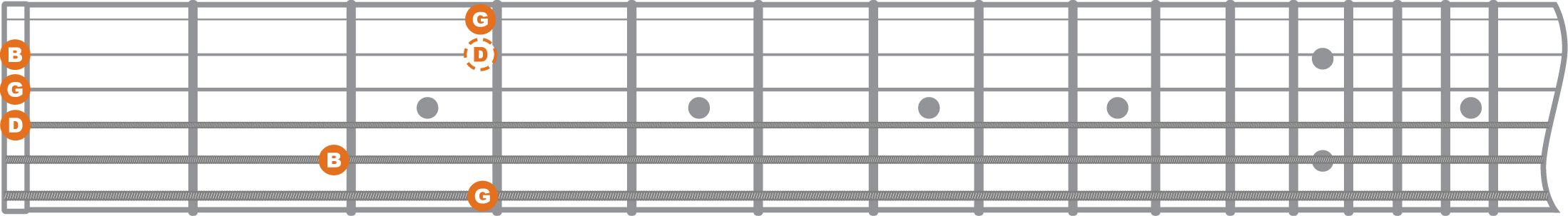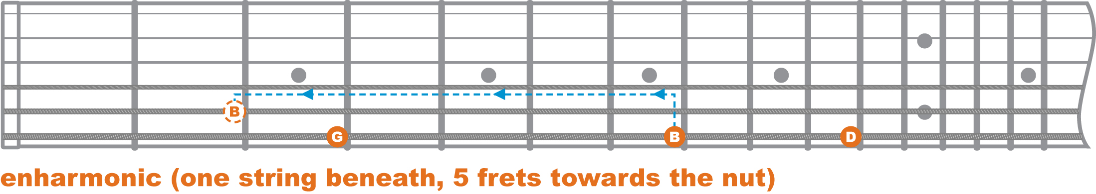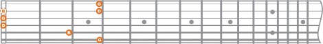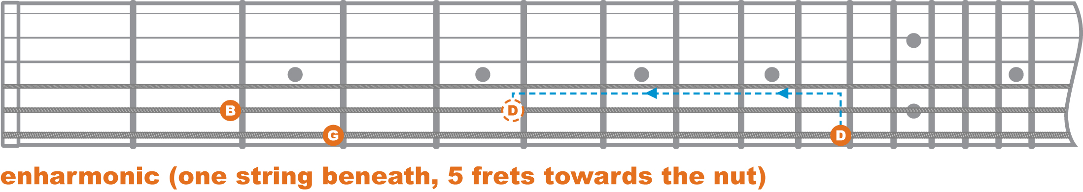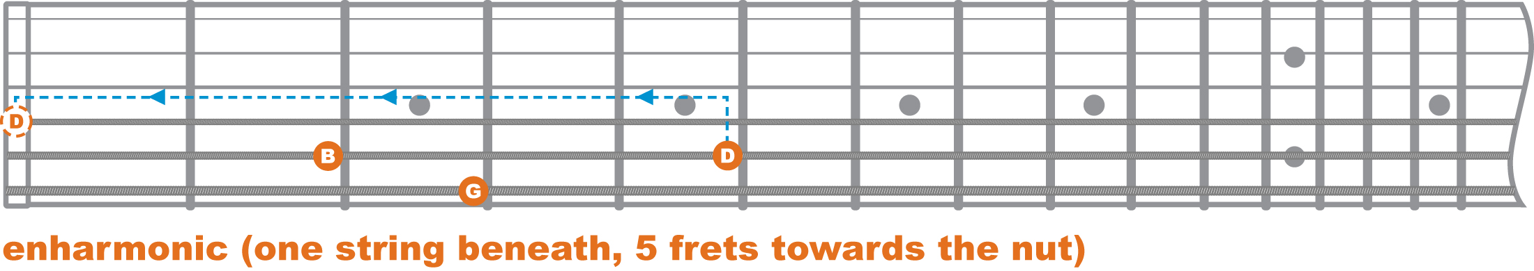 Now D is on the same string as B. We still need to move it one more time. Will we have five frets to work with? Let’s see: