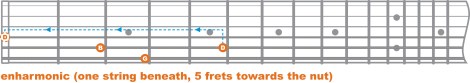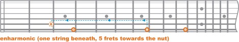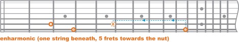 Now that we’ve spelled our triad, we have to move each note to its own string so that the three notes can be played simultaneously. By now, you should be familiar with the process of finding an enharmonic note to the one you are currently using. Let’s see it in action: