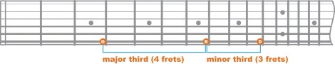 In this example, the root is G, the third is B and the fifth is D, but we could’ve used any note as the root. Here, we started with our root G, added a major third and landed on the B, our third. From B, we added a minor third and landed on D, our fifth. We simply used our major third + minor third recipe to create a G major chord. I’d like to point out that the distance between our root and fifth is still seven frets, or a perfect fifth, like it was in the power chord.