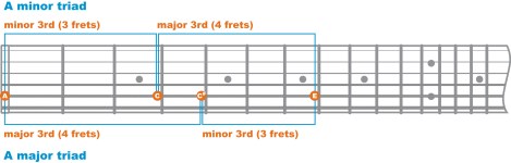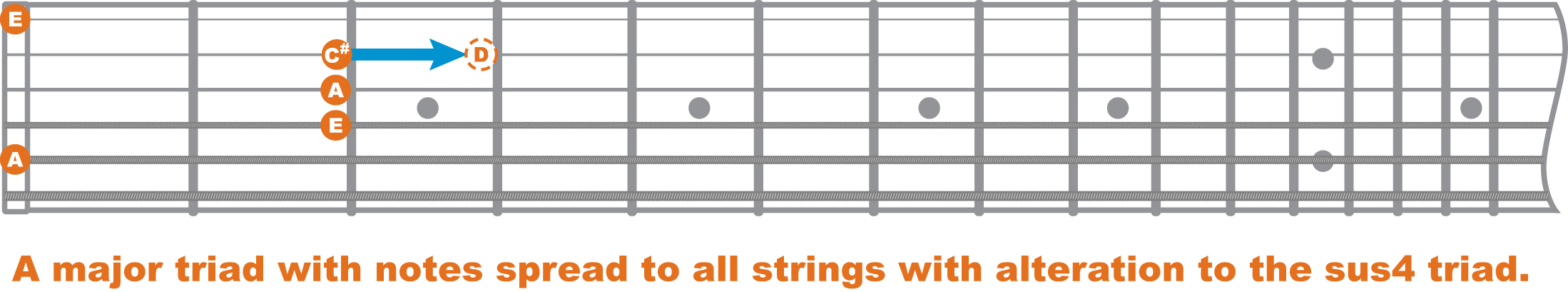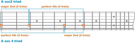 As you can see, the recipes that I discussed above hold true. The A sus2 triad follows the major second + perfect fourth recipe. The A sus4 triad follows the perfect fourth + major second recipe.