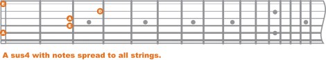 Now, let’s look at a sus4 chord, which really is the exact opposite of a sus2 chord. Remove the third from a major or minor chord and replace it with a note that is a perfect fourth away from the root. The recipe for a sus4 chord is: