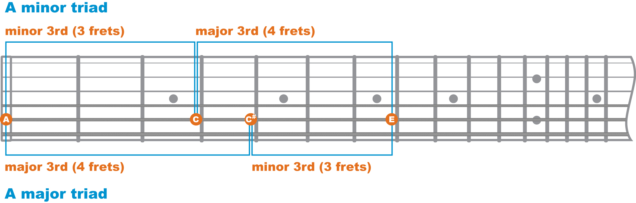 Let’s build an A sus2 and an A sus4 chord to see the chord in action. Since a sus chord can be thought of an altered major or minor chord, let’s build an A major and an A minor chord first. As you can see below, the third for the minor triad is C♯; the third for the major triad is C: