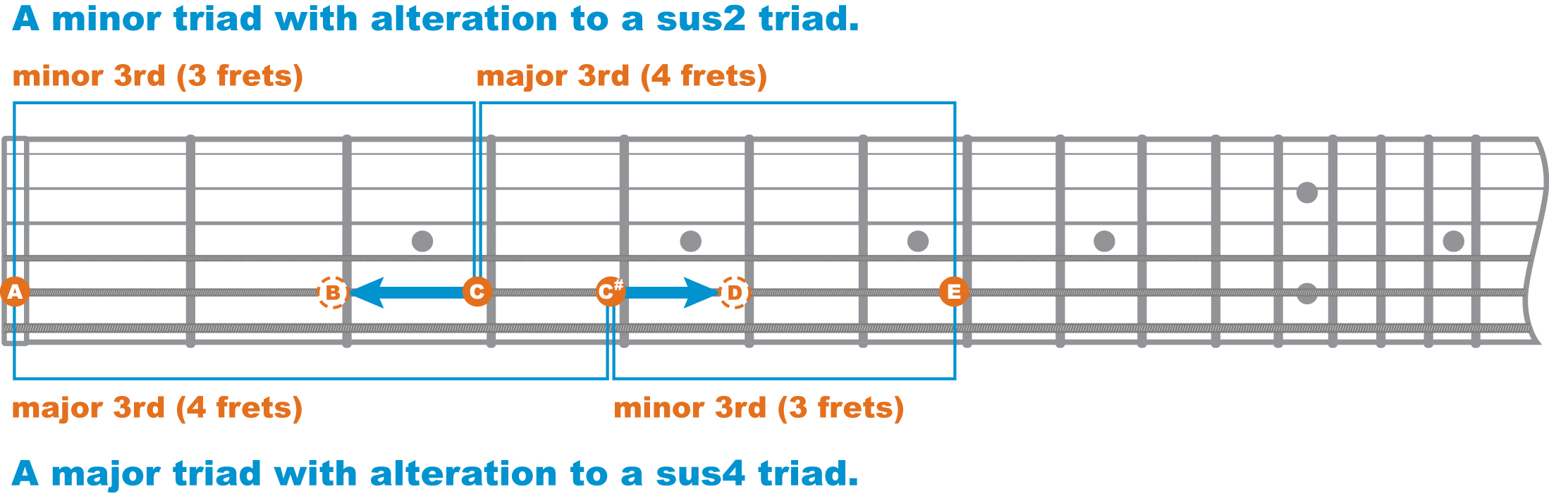 Now, we’re going to create an A sus2 by flattening the third in the minor triad. We’re also going to create an A sus4 by sharpening the third in the major triad. Be doing so, we’ll recreate the recipes that we discussed above. Thinking of sus chords as altered major and minor chords is a mental shortcut: